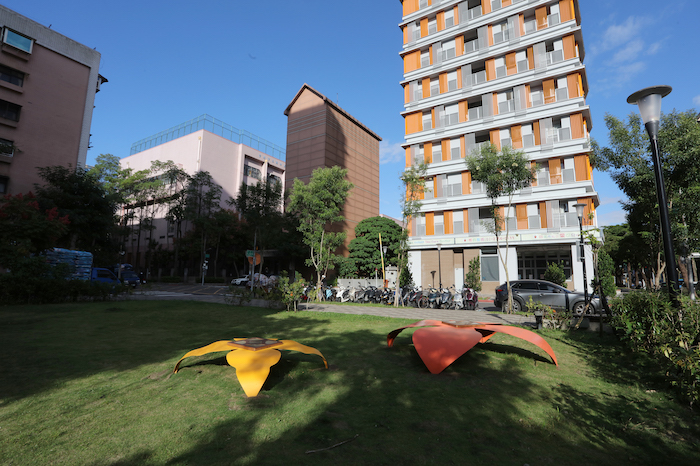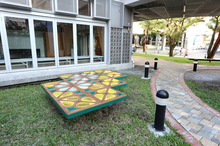 矮平房門口的桂花、九重葛盛放,繁花似錦;水泥花磚、鐵花窗,悠哉閒坐的一整個下午。這件作品延續健康公宅前址─婦聯五村的眷村歷史記憶,轉化熟悉的眷村植栽與花格磚,創造出鋪陳於日常生活的街道家具。花磚記憶特有的光影,形成對話、溝通、分享的關係。