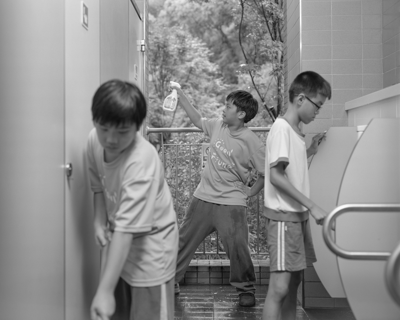 我被分到打掃我們學校二年級廁所的地方。有一次因為廁所實在太臭了,老師讓我們噴泡泡!這也是我們第一次噴泡泡。我們在裡面邊沖水邊噴泡泡,還拿拖把跟刮刀,看誰水濺得比較高!當水潑到我們時,超涼快的!從此以後,打掃廁所變成了每天我最期待的時候。