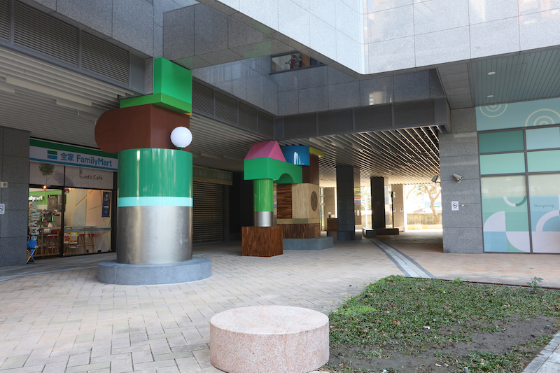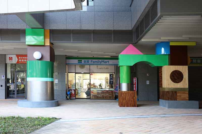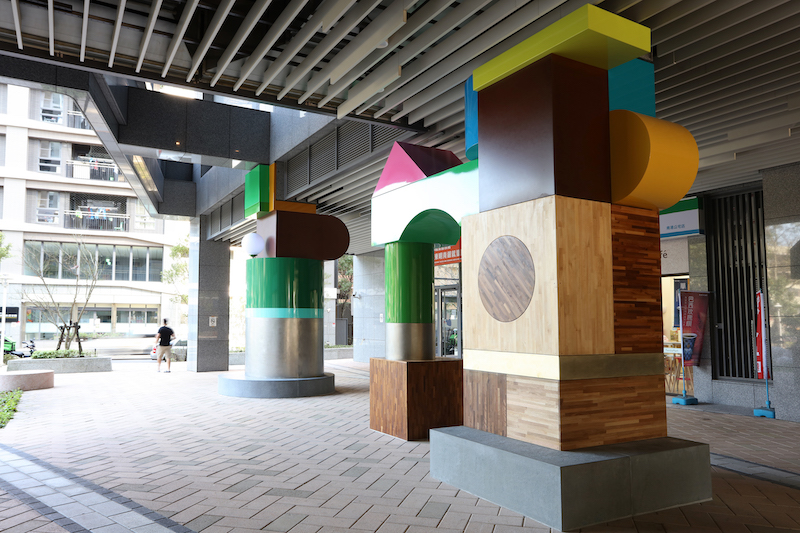 《家的想像》打破規矩的列柱形式,將造型元素延續至中庭,融合照明、休憩等機能。以木、石、金屬為主要材質,搭配繽紛的彩色塗裝,產生視覺、觸覺上靈活變化的體感經驗。就像積木一樣,每個人都用不同的方式建造家園、產生不同的家的詮釋。