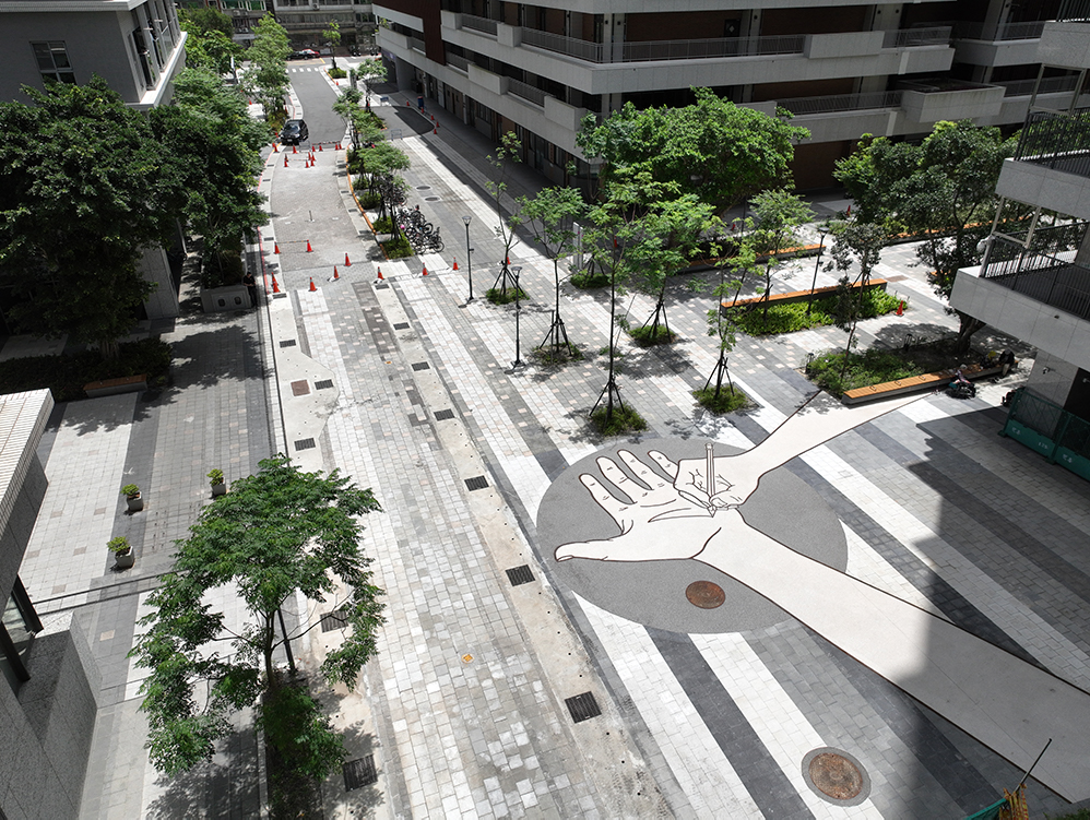 藝術家Ram Katzir以大型地畫的方式,勾勒以一手描繪另一手的手掌掌紋的圖像,暗示人能積極掌握生命的能動性,傳遞「未來」操之在己的美好理念。《書寫未來》位於整體社區中央綠軸線,亦可從四棟建築的高處俯瞰,迎接人們走入藝術與生活共融的境地,也指向「社宅」作為公共建設政策的核心意義-翻轉生命及生活的可能性。作品表達對生命誠摯熱切的期盼,與周遭社區共享社會文化價值,期望啟發居民開啟對於「未來」的想像和追尋。
