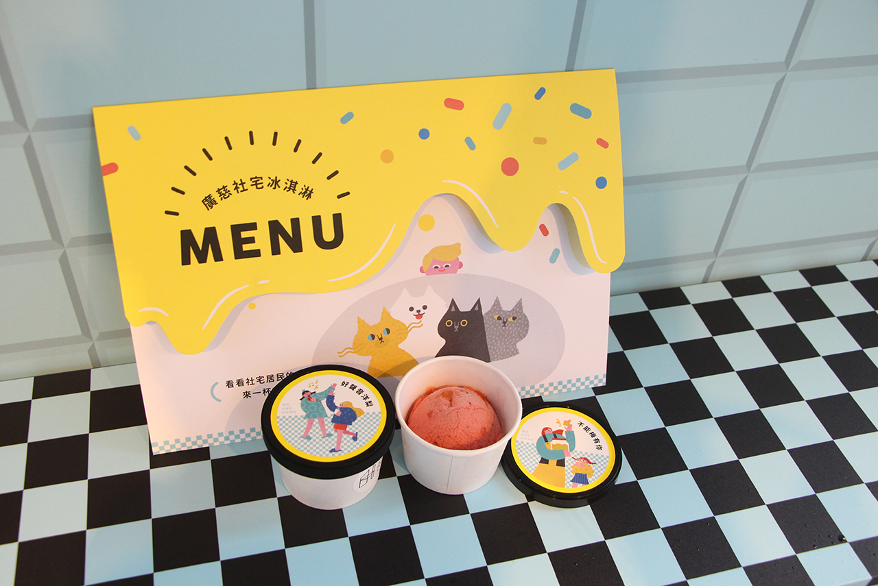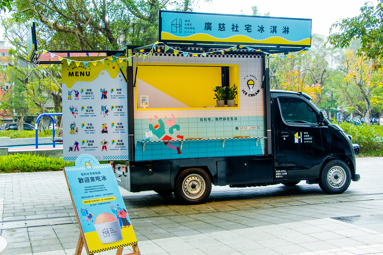 <我的社宅有點甜-冰淇淋行動>在社區居民進駐前期,採集了十位廣慈社宅青創朋友的故事,將大家對社宅新生活的種種期待,轉變為適切的冰淇淋口味,並於2022年6月至12月期間,以行動串聯臺北市的社宅,巡迴社宅、公園、街區、臺北文創等7個地點,邀請人們畫下在家的樣子,換一杯有故事的冰。