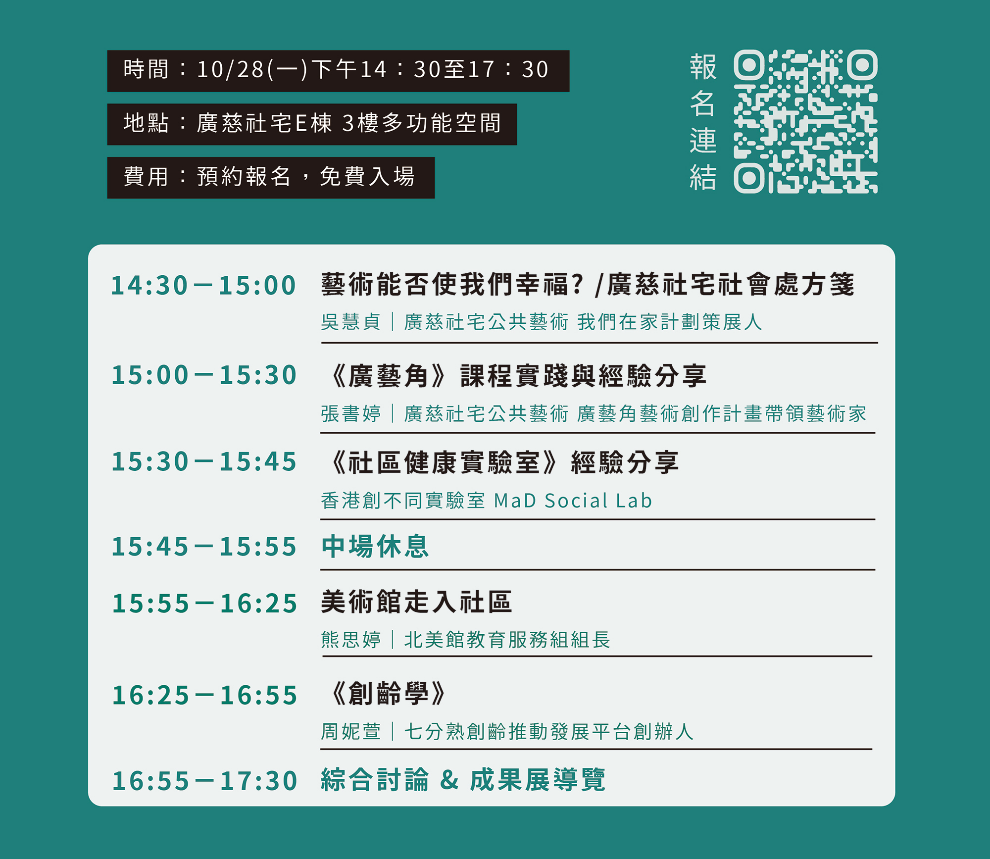 廣慈社宅公共藝術以《我們在家》作策展命題,將「社會處方箋」納入計畫,希望以社區為核心向外擴散,在地方策動一場社會療癒實驗。廣慈社宅的社會處方箋,共有三個主題帶狀工作坊─《廣藝角》《即興藝術共融場》、《樂音療癒場》,分別由藝術家張書婷、黎美光、陳沛元主持。策展團隊也盤點了社區資源,編輯一份《社會處方箋資訊平台手冊》與網站,呼應文化近用的概念,形塑「廣慈文化生活圈」與社區分享,並於2024年10月28日辦理這場講座,邀請所有關心此議題朋友參與交流,共創友善社區。