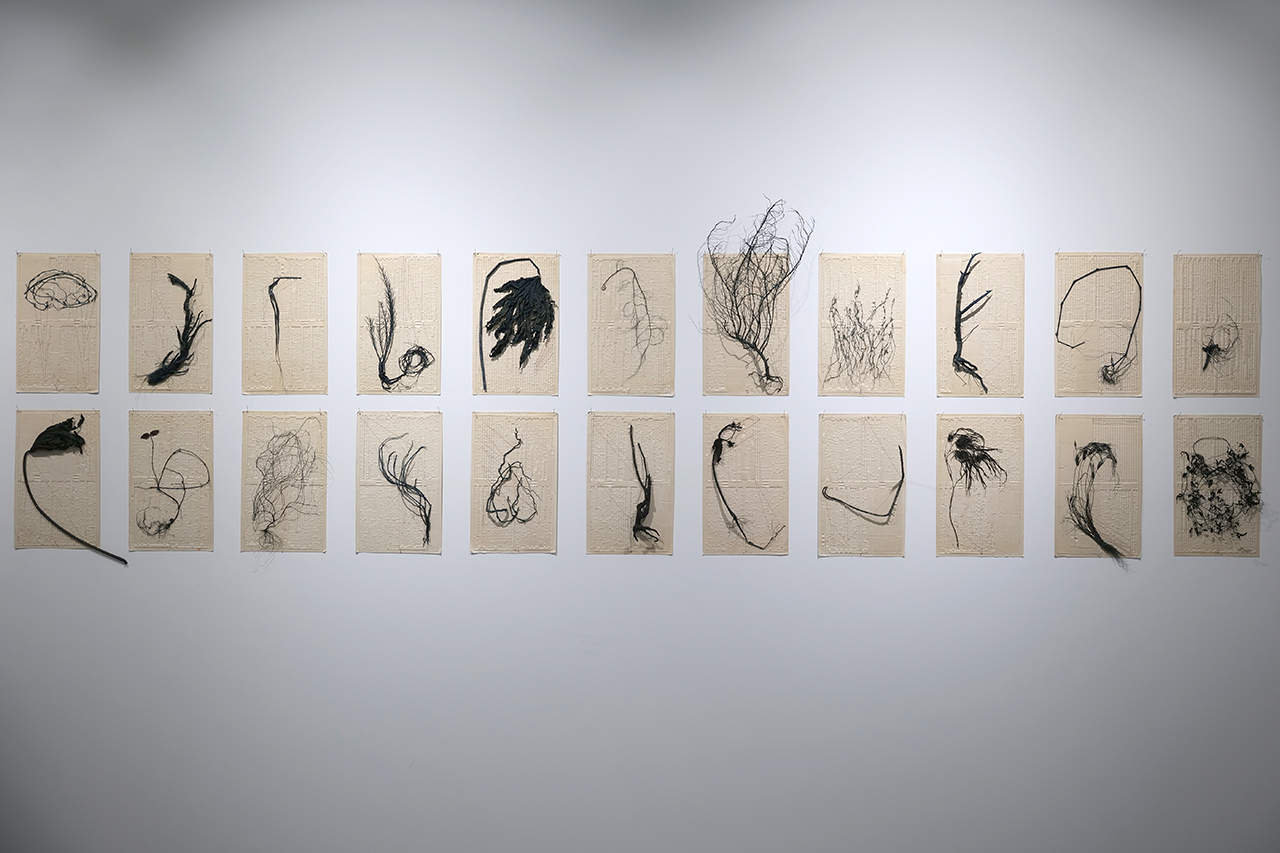 藝術家以纖維和藍染工藝的手法與社區連結、轉譯,從傳統地緣的自然素材延伸至身邊充滿故事性的現成物,也以續命、重生等議題,回應因工業廉價生產而越來越快速消費的時尚觀。