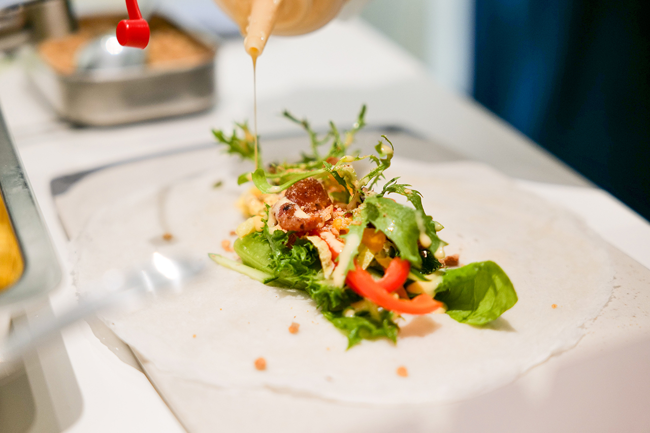 第二場的青蔬紅糟潤餅捲,脫胎自王鍾山老師的教學,融合傳統閩南紅糟肉與現代健康蔬食概念,加上自製美乃滋和堅果碎,將清明家族團聚共享的食物,轉化為符合當代人的輕食口味。食物份數增加到250份,社區主廚們卻更有默契信心,從前置的紅糟醃肉、自製美乃滋,到活動當日煎炸肉排、蔬菜切洗,包潤餅捲,游刃有餘;民眾看到辛勤包潤餅的社區主廚們,紛紛表達謝意,為活動現場增添一絲絲暖意。