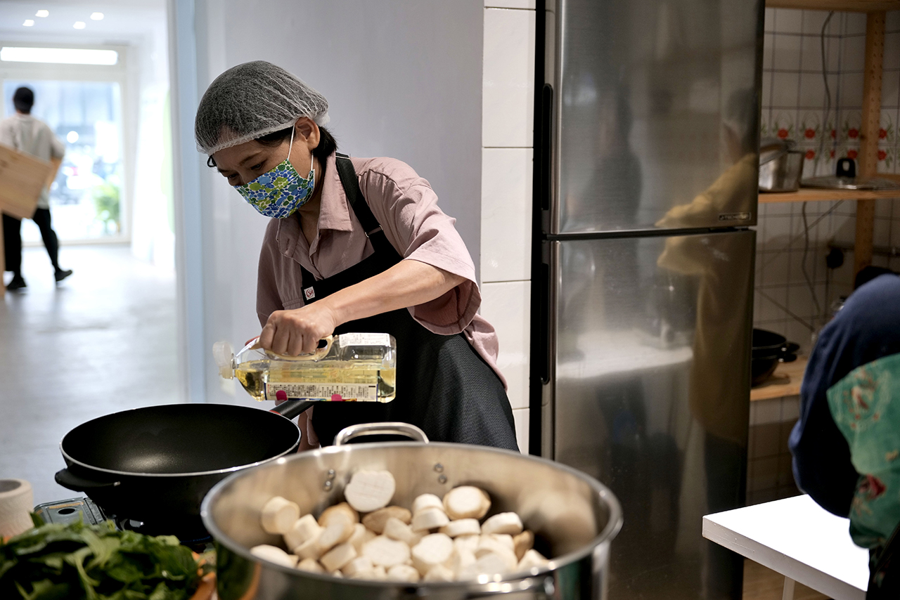 第一場三杯台味便當,轉化自料理工作坊的學習,三杯靈魂醬料─醬油、麻油、米酒,搭配平價易得的杏鮑菇,下鍋爆香翻炒,不僅是標記台灣街頭飲食的經典味道,也是學員們與社區分享的第一道手藝。活動當天,學員們化身社區主廚,將對社區和料理的愛與熱忱,化作170份美味佳餚,平時照顧家人的手藝轉而照顧社區,辛苦化作滿滿的成就感。