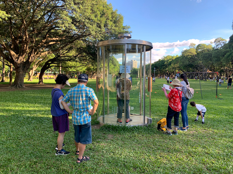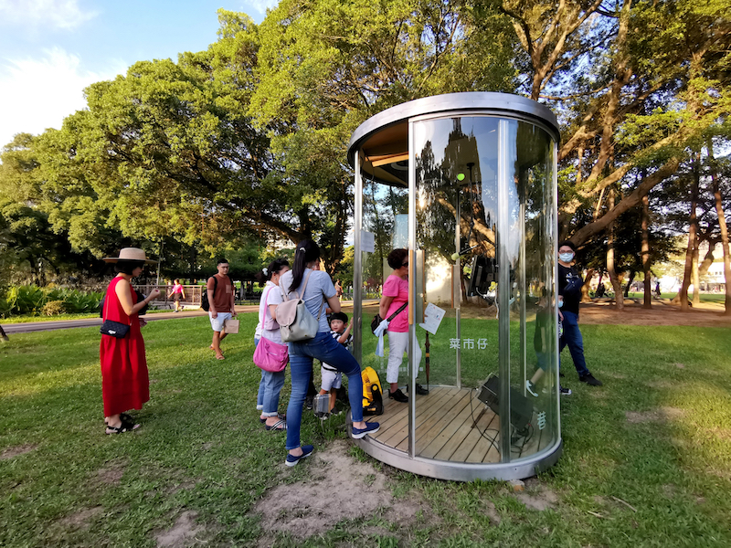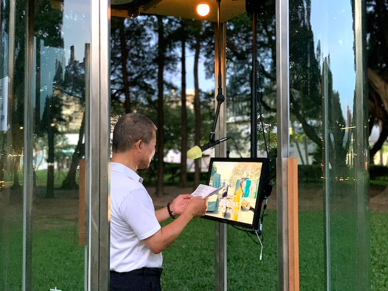 藝術家觀察青年公園裡的卡拉OK文化,將涼亭空間轉為無聲的密閉點唱系統,選錄曲目並在當地脈絡下改寫歌詞。作品觸及當下流行文化的主體識別創造,同時探討歡唱行為於公私領域的世代差異。