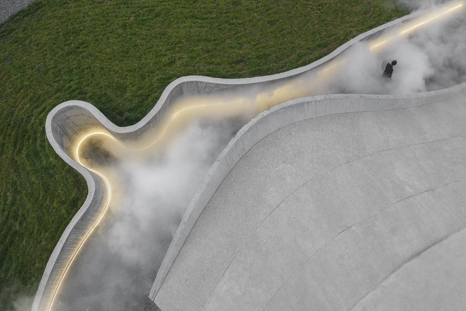 兩道不規則彎曲的混凝土牆,隔出了一條蜿蜒走廊,這些牆面的曲線,取自高雄港灣的線條,象徵都市和自然的交界。行走其間,暗藏的水霧裝置不時啟動,教人彷彿身處迷霧中,無須龐大量體或複雜設計,一條小徑示現什麼是美,這便是藝術的魅力。